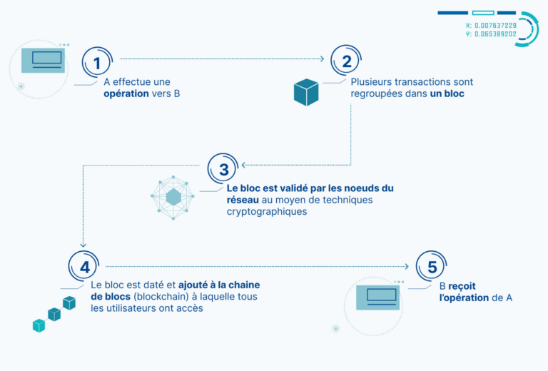 - Les données stockées sur la blockchain sont visibles par tous les utilisateurs de la chaîne de blocs, et il n’y a pas de tiers centralisé qui contrôle ces données. Cela rend les données plus fiables car elles ne dépendent pas d’un seul point de faiblesse (comme un serveur centralisé) qui pourrait être la cible de cyberattaques. La blockchain est utilisée pour assurer la transparence et la confiance. Notamment avec l’utilisation de contrats intelligents (smart contract*) permet d’assurer des interactions autonomes entre les personnes et les machines. Par exemple, il n’y a plus d’intermédiaire pour réaliser des opérations bancaires ou pour faire de la finance décentralisée*.De plus, la blockchain utilise un système cryptographique de validation par les utilisateurs pour stabiliser les données. Cela signifie que les données sont chiffrées et stockées de manière sécurisée sur la chaîne de blocs, ce qui rend difficile pour un tiers d’y accéder ou de les modifier. Ce système contribue à protéger les utilisateurs contre la fuite de leurs données et engage une meilleure transparence et la traçabilité de l’information.